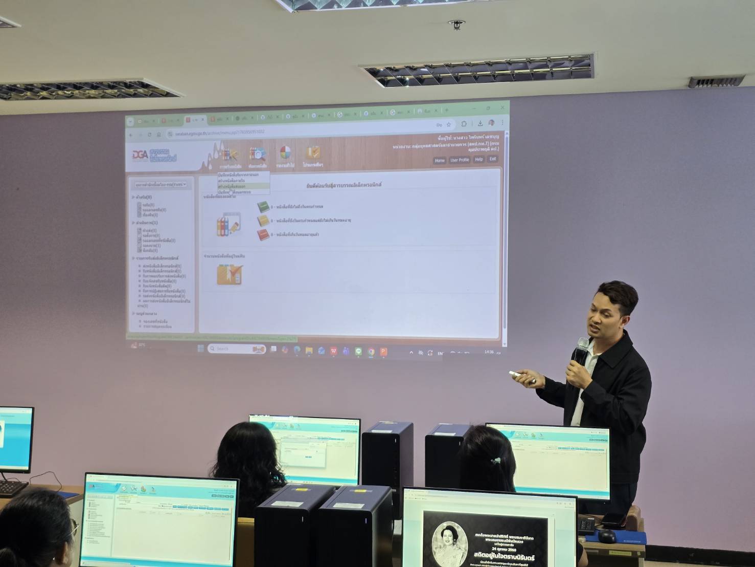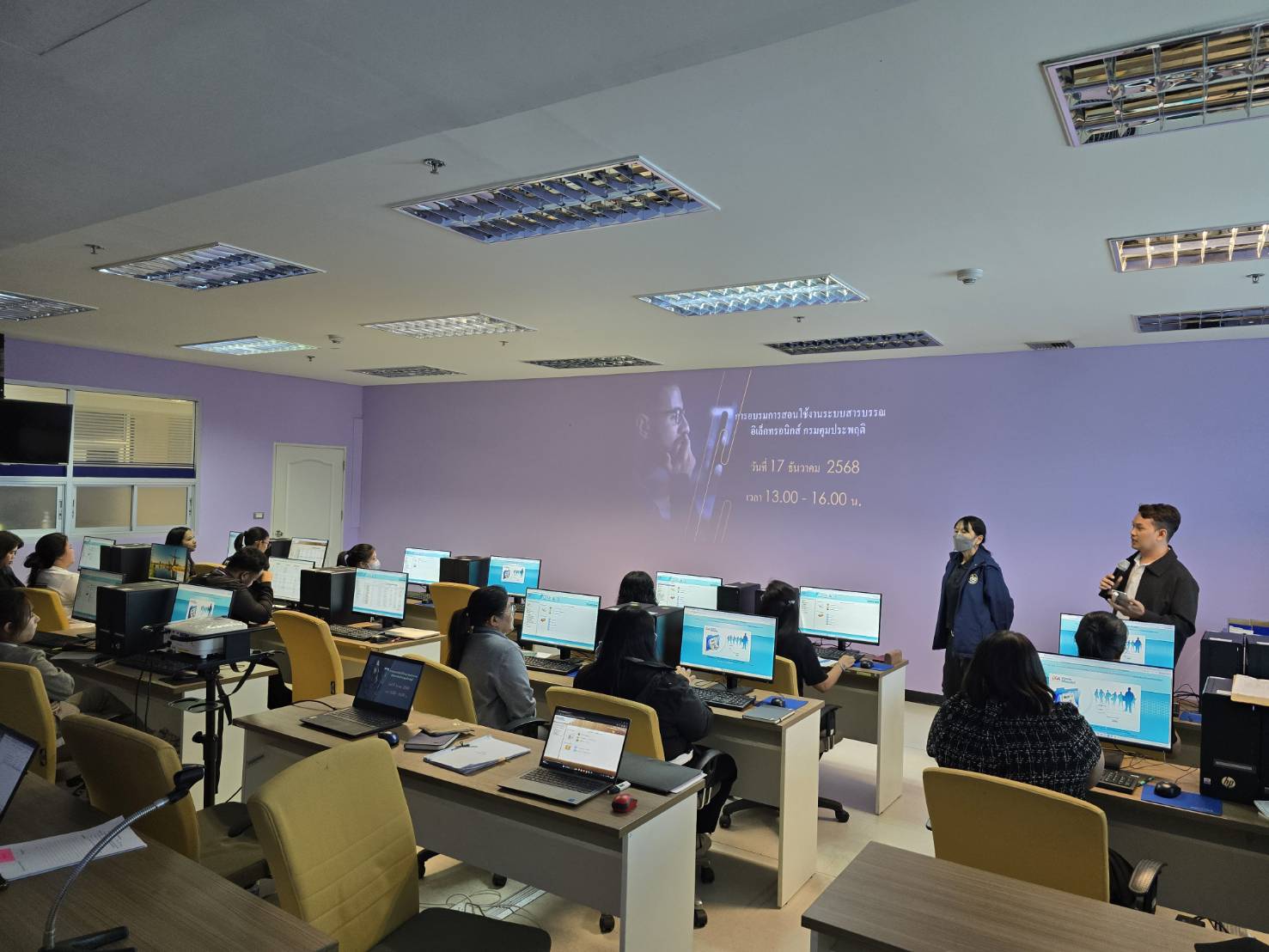 วันที่ 17 ธันวาคม 2568 ศูนย์เทคโนโลยีสารสนเทศและการสื่อสารนำโดย นางสาวขนิษฐา คะนึงทอง นักวิชาการคอมพิวเตอร์ชำนาญการพิเศษ รักษาราชการแทนผู้อำนวยการศูนย์เทคโนโลยีสารสนเทศและการสื่อสาร นายวีรศักดิ์ ชันประสิทธิ์ นักวิชาการคอมพิวเตอร์ปฏิบัติการ และ ว่าที่ ร.ต.ธนะสิทธิ์ เมธาวี นักวิชาการคอมพิวเตอร์ปฏิบัติการ จัดการอบรมหลักสูตร สารบรรณอิเล็กทรอนิกส์